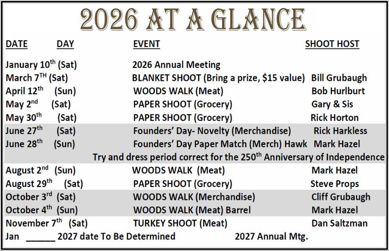 We are a traditional muzzle loading gun club that holds monthly shoots (with prizes) and special events. We have a lot of fun here and we make sure you'll have a great time, too. We do our best to keep our event costs down.